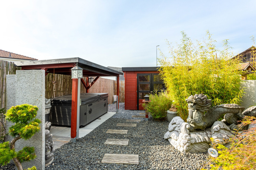 – liebevoll gestalteter Asia-Garten mit Jacuzzi und Gartenhaus